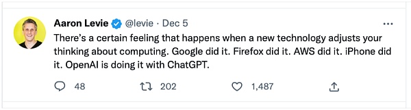 知名的科技投資人Box 首席執行官 Aaron Levie也表示:“當一項新技術調整了你對計算的想法時,會有一種特定的感覺。谷歌、 火狐、 AWS 、iPhone 都做到了。OpenAI 正在通過 ChatGPT 做到這一點”。