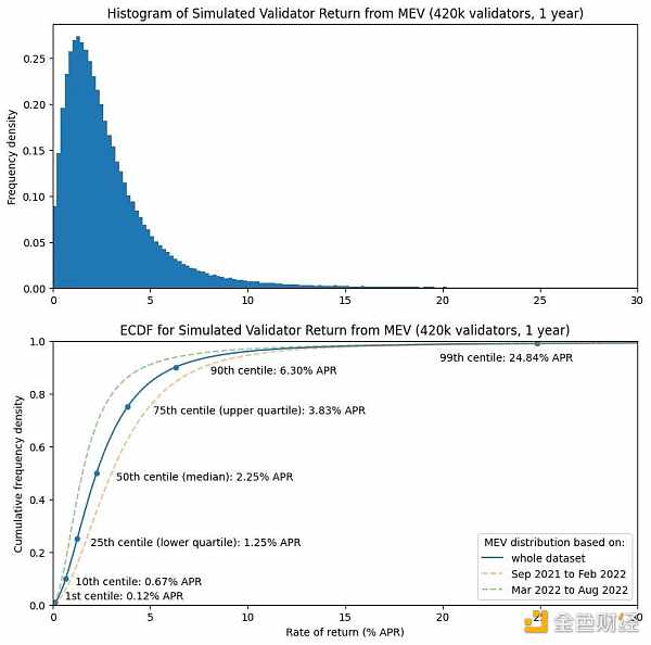 因此,以中位數為基準,當基于「高 MEV」期間 (即 2021 年 9 月至 2022 年 2 月) 的數據時,MEV 似乎為驗證者的 APR 增加了約 3 個百分點,而當我們使用「低 MEV」期間 (2022 年 3 月至 2022 年 8 月) 的數據時則增加了約 1.5 個百分點。然而,一些驗證者在一年的時間里幾乎沒有從 MEV 中獲得任何回報,而少數幸運的人卻可以獲得超過 100% 的收益。