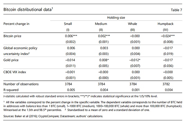 表7顯示,在價格上漲的時期,小的比特幣持有者傾向于買入,而大的比特幣持有者傾向于售出。這也符合一個由新進入者維持的市場,允許早期投資者和內部人士以他們為代價兌現。