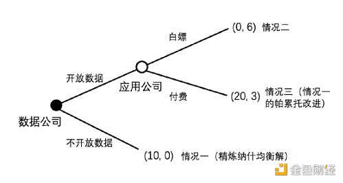 在此次動態博弈中,數據公司(也就是如騰訊等擁有數據的 Web2 巨頭)有開放數據和不開放數據的選擇。若其開放數據,應用公司可以選擇白嫖或者不白嫖。在博弈樹的葉子結點,括號內第一個數表示數據公司的效用,第二個數表示應用公司的效用。