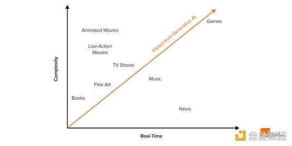 就目前所涉及的資產類型( 2 D 藝術、 3 D 藝術、聲音效果、音樂等)而言,游戲是娛樂類目中最復雜的一種,同時,游戲也是互動性最強的,它非常強調實時體驗。這就為新的游戲開發者創造了一個非常高的進入門檻,也為制作一個真正的 3 A 大作游戲創造了高昂的成本,這些存在的門檻和成本問題,為生成式人工智能在游戲領域的破壞性創新,創造了巨大的機會(如下圖):