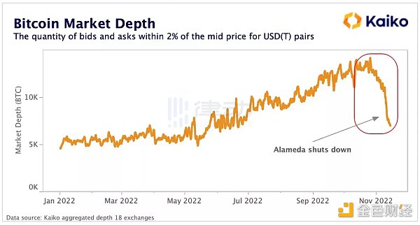根據 Kaiko 報道,自 11 月 5 日 CoinDesk 公布其對 Alameda 資產負債表的調查之日起,在中間價 2% 以內的 BTC 流動性已從 11.8k BTC 降至僅 7k,為 6 月初以來的最低水平。ETH 市場也受到崩盤的影響,市場深度跌至 5 月底的水平。