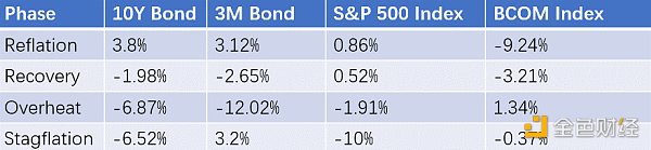 衰退期(reflation):10年期國債表現最好,并且由于債券收益率重新變陡,以3月期國債為代表的短期國債也有不錯的表現。相對應的,這期間大宗商品表現最差。