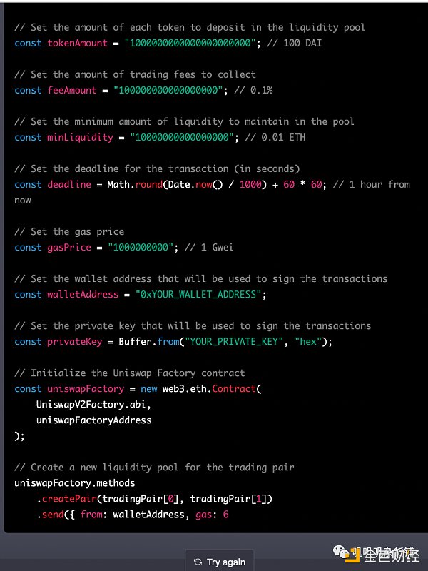 大概看一下它的邏輯和代碼結構,我們會發現它基本上已經是一個可用的sniper bot. 甚至連feeAmount這種條件都考慮到了。當然,它最后的創建新池是沒必要的,我們可以稍微調整下邏輯改成監控現有池子即可。當然可能你輸入同樣的命令生成的代碼里不是這個邏輯,不過影響并不大