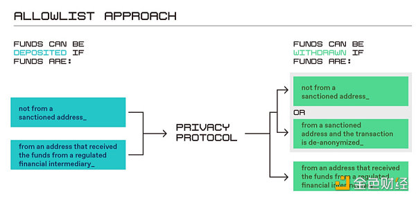 第一種方法涉及篩選錢包,以防止資產存款來自與漏洞利用、黑客攻擊或某些其他非法活動有關的受制裁實體。這可能涉及政府托管的黑名單以及區塊鏈分析公司提供的鏈上預言機服務或數據源。隱私協議的智能合約在接受資金進入其資金池之前會 "調用 "相關的區塊鏈合約,如果資金來自黑名單地址,存款請求將失敗。人們還可以將其與“許可名單”方法結合起來,使資金更容易從從受監管的金融中介機構(例如加密貨幣交易所)接收資金的地址存入,如下圖所示。存款篩選是一個很好的第一步,但孤立起來是不完整的,正如我們在第 11 頁開始的論文中更全面地討論的那樣。