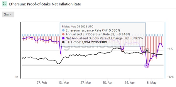 5月初,由于與meme相關的網絡擁堵而導致的交易費用最近升高導致ETH燃燒率激增,ETH短期換算的年通脹率一度達到了-8.3%。