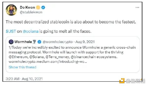 2021年10月20日,Kwon在推特上寫道,Wormhole將“UST”帶到Solana、以太坊和幣安區塊鏈上,并寫道“Web3將是一個相互連接的區塊鏈網絡,而UST將為網絡鋪設高速公路。”