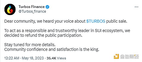 但Turbos的IDO表現同樣不佳,IDO價格約為0.0055美元,截止5月18日已經跌至0.004美元。社區質疑團隊在IDO后解鎖了大量代幣,Turbos團隊也在5月18日表示,會退還IDO中籌集的資金。