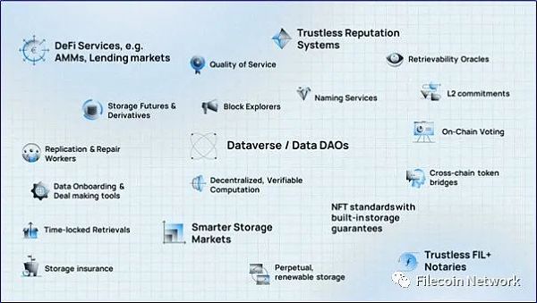 支撐專門的網絡:具有專門任務的獨立網絡,用于改進Filecoin網絡的功能。一些例子是去信任的聲譽系統(根據鏈上指標匯報存儲供應商的服務質量/聲譽分數),數據可用性抽樣網絡(讓存儲提供者測試其效率/可靠性,并根據結果給予激勵)和內容交分發網絡(無論地理位置在哪里,都能無縫和快速地檢索和分發存儲在Filecoin網絡中的數據)。