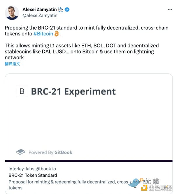 據《比推》報道,5 月 7 日,跨鏈互操作性項目 Interlay 的創始人 Alexei Zamyatin 提議推出 BRC-21 標準,以向比特幣網絡上引入完全去中心化的跨鏈資產,并在閃電網絡中使用它們。根據BRC-21 代幣標準 V 0.1 版本文檔描述,BRC-21 資產本質上依然是 BRC-20 資產,但與“憑空生出”的 BRC-20 資產不同,BRC-21 需要通過鎖定起始鏈上的資產來生成(比如 ETH、DOT、ATOM、DAI 等等),換句話說,BRC-21 標準提供了一種在比特幣網絡上鑄造 BRC-20 版本 ETH、DAI 等其他鏈上資產的可能性。