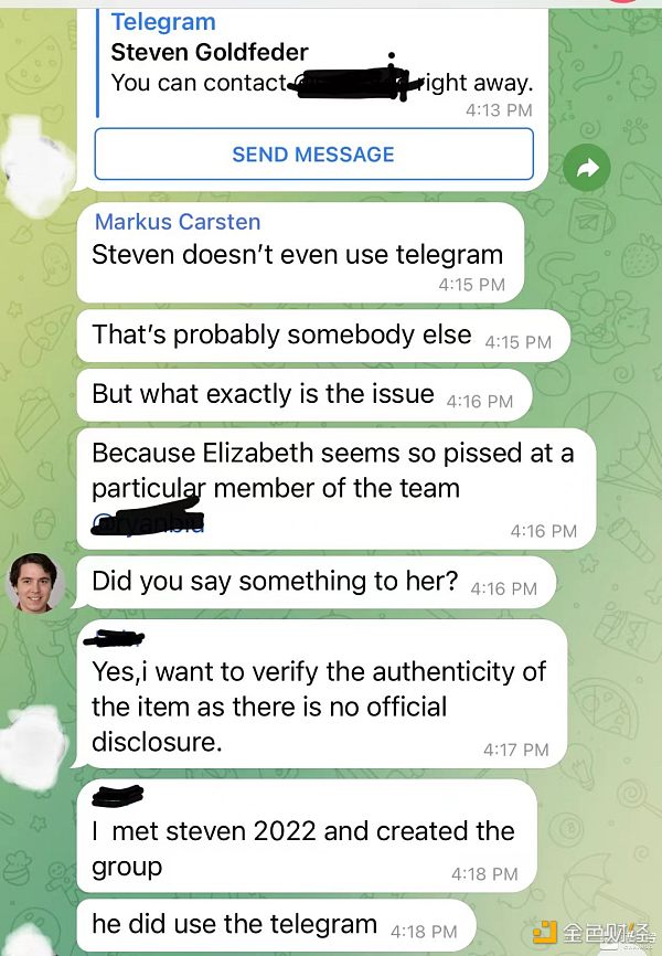 而Echo則對為什么“Steven Goldfeder”沒有進群進一步溝通提出了疑問,從始至終,除了一開始的Zoom會議,“Steven Goldfeder ”就在沒有出現。對方解釋說,“Steven Goldfeder ”并沒有Telegram賬號。