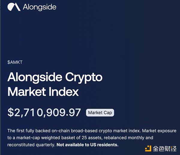 我們要說的下一個項目是Alongside Finance,其團隊曾對Phuture做出過一些不準確的評論。然而,我們不是來討論這個的,我覺得他們的產品很有趣。迄今為止,他們的第一個也是唯一一個產品是Alongside加密市場指數(AMKT)。與Phuture和Index不同的是,Alongside基于Coinbase創建自己的產品,所有指數基金都由Coinbase Custody托管。