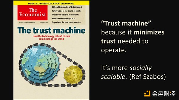 區塊鏈通過使用密碼學和共識機制而不是聲譽,提供了對交易更高的信心,只需很少的花費,在幾秒鐘或幾分鐘內完成轉賬。換句話說,作為“信任機器”,區塊鏈技術最大限度地減少了運作所需的信任(人類/銀行),從而使得越來越多的人能夠在無需中間人的情況下進行交互。Nick Szabo將其稱為“社會可擴展性”。