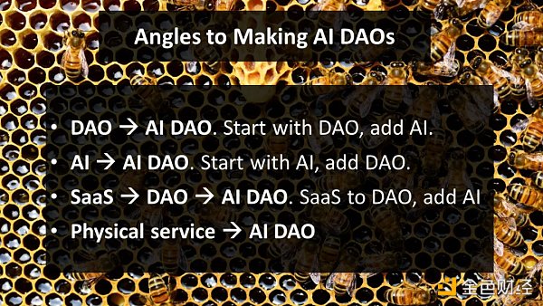 有幾種方式來構建 AI DAOs。可以從 DAO 開始,然后加入 AI;或者可以從 AI 開始,將其放在去中心化的基礎設施上。或者從軟件即服務(SaaS)出發,也就是某個公司運行某項服務,將其轉化為 DAO,并加入 AI。