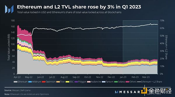 DeFi活動的下降可能是由于以太坊Layer-2(L2)的作用日益增大。自L2推出以來,其交易份額每個季度都在穩步增長。2023年第一季度,L2占交易份額從2022年第四季度的38%增加到2023年第一季度的45%。由于Optimism的激勵計劃在1月份結束,L2份額有所下降,但隨著Arbitrum交易的增長,它在本季度后期恢復了增長。在ARB代幣發布當天,L2份額創下了73%的歷史最高水平。