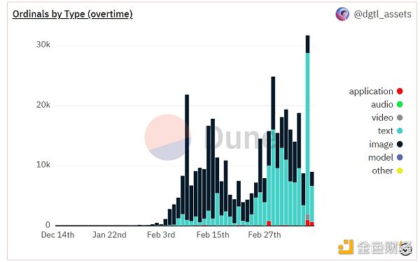 從3月9號開始,Domo的“BRC-20代幣”拉開序幕,自那以后,用戶通過BRC-20和Ordinals協議部署了受Meme啟發的代幣,比如Doge、Pepe等。另據Dune Analytics分析(如下圖所示),自BRC-20實施上線以來創建的絕大多數序號銘文都是基于文本,其次是圖片、應用程序和視頻。