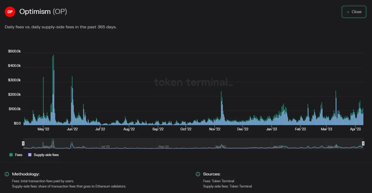與此同時,通過 Optimism 產生的 80% 的費用如今都歸以太坊驗證者所有。自 2021 年成立以來,所有費用的 74% 支付給了以太坊 L1。下面是 Token Terminal 提供的數據: