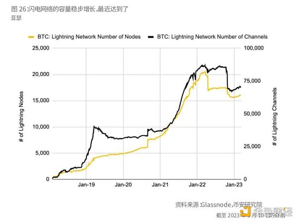 如圖 26 所示,閃電節點的數量在過去幾年一直呈上升趨勢。同樣,在閃電網絡上創建的通道數量也有所增加。