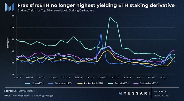 Frax 的 sfrxETH 在 1 月底通過一種創新的流動性質押模型加入了流動性質押領域。從那時起,Frax 利用其在 Curve 的計量系統上的控制權將 CRV 獎勵引導至 frxETH / ETH Curve 池。由于 Frax 的質押設計,這產生了下游效應,提高了 sfrxETH(Frax 的流動性質押衍生品)的質押收益,并在上市的前三個月為其提供了領先的收益。