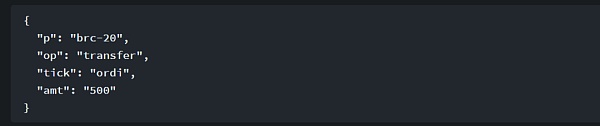 按照下面的格式鑄造銘文,"ordi"修改成你要發送的代幣的符號,amt 對應要發送的數量,數額不能大于你的賬戶余額,「to」和"fee"字段不是必須的。