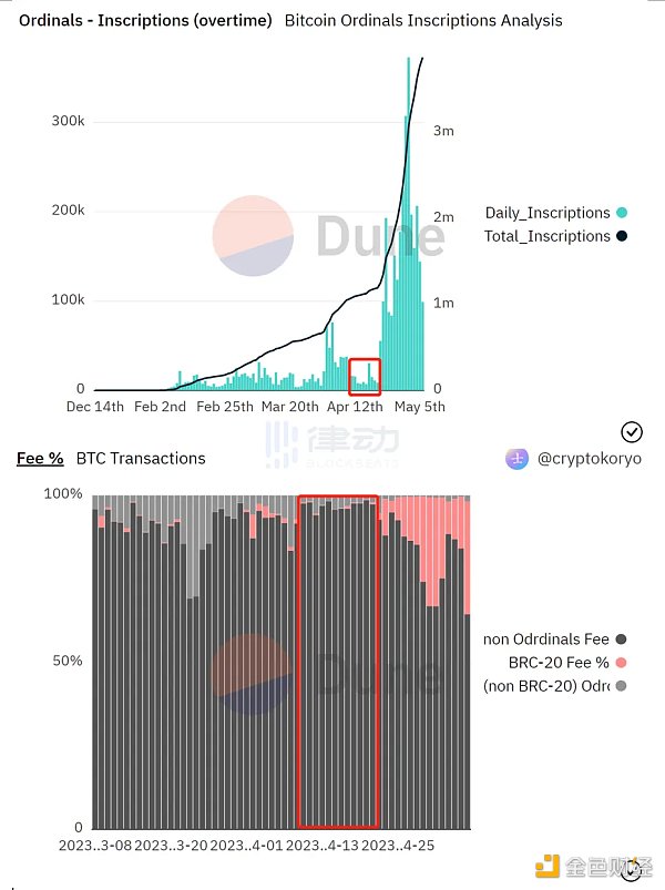 4 月 9 日 - 4 月 20 日這段時間,銘文的每日增量出現了一個周期性的低谷。(如下圖中藍色柱狀圖的紅框部分所示)而在 4 月 23 日之前,僅出現過一次 BRC-20 當日交易手續費占比超過非 BRC-20 銘文交易手續費占比的情況,大部分的時間里,非 BRC-20 銘文交易手續費占比都遠比 BRC-20 交易手續費要多。(如下圖中黑灰色柱狀圖的紅框部分所示)