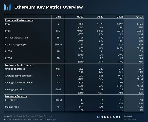 DeFi活動的下降可能是由于以太坊Layer-2(L2)的作用日益增大。自L2推出以來,其交易份額每個季度都在穩步增長。2023年第一季度,L2占交易份額從2022年第四季度的38%增加到2023年第一季度的45%。由于Optimism的激勵計劃在1月份結束,L2份額有所下降,但隨著Arbitrum交易的增長,它在本季度后期恢復了增長。在ARB代幣發布當天,L2份額創下了73%的歷史最高水平。