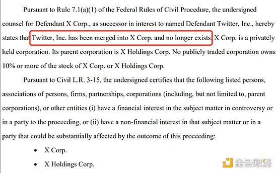 在當地時間本月4日遞交加州法院的一份該案件相關法律文件中,推特的律師表示:“Twitter, Inc.已經并入X Corp.,不再存在了。”