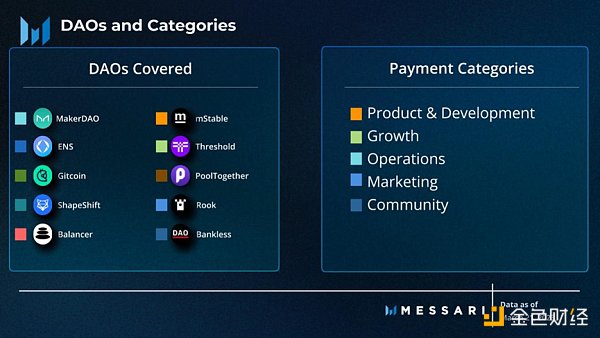 在選擇了要涵蓋的 10 個 DAO 之后,Messari 將這些費用支出分為五個類別:產品和開發、增長計劃、運營、營銷和社區。