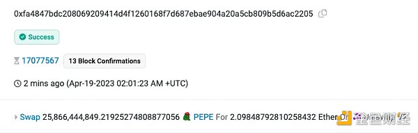 今日 10: 01: 23 時發生在同一個區塊內的兩筆交易可以被視作 jaredfromsubway.eth 的典型操作手法。在 0x4840 開頭的交易中,jaredfromsubway.eth 使用 2.076 ETH 換得了 25,877,592,751 PEPE,然后又在 0xfa48 開頭的交易中將這些 PEPE 全部換得了 2.098 ETH。