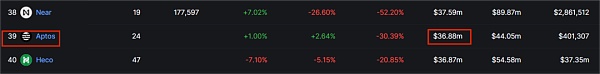在總覽中可以看到 Aptos 排名 39,鎖倉量只有3600 萬美元左右,而 Arbitrum 排名第四,鎖倉量有22億美元左右,Arbitrum 鎖倉量大致有 Aptos 的 60 倍,差距不可謂不大。即使是前兩年大火的 solana 也只有2.86億美元,只有 Arbitrum 的八分之一。