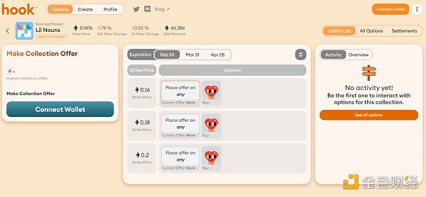 Hook 是構建在 Ethereum 上的 NFT 歐式看漲期權協議,采取混合現金和實物結算方式。目前提供 Lil Nouns、Otherdeeds、Chromie Squiggle、MAYC、Friendship Bracelets 等11種 NFT 期權交易,其中在過去 30 天 MAYC 期權市場已經完成了 40.864k ETH 名義交易量。Hook 通過在期權到期前一天開始拍賣相關的 NFT 資產來結算期權,若競標者在結算拍賣中出價高于執行價格,NFT 就會被出售。期權賣方實則類似于實物結算,收到了執行價格;期權持有人則類似于現金結算,受到出價和執行價格之間的差額。此外,期權持有人只需要在結算期權中出價即可以完成 NFT 實物交割,并在期權關閉后收到高于執行價格的任何出價金額的退款。Hook 收取出售期權時 10% 的費用。目前 Hook 通過了 Sherlock 的審計,并投保了 500 萬美元的保險。