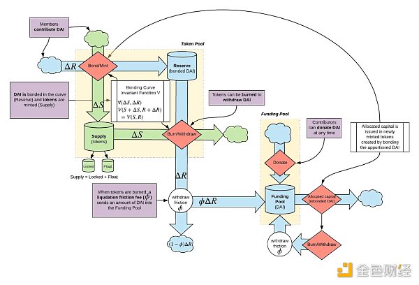 上圖是添加了一些有趣內容的增強結合曲線。增加的內容包括「孵化期」,即鑄幣前期階段,早期投資者可以存入資金以獲得代幣并做出早期貢獻。一些資金直接流向曲線本身,一些資金流向國庫,這些資金可用于聯合曲線外的資本配置,以促進產品的發展。除此之外,還有一個在初始階段授予「孵化器」代幣的歸屬時間表,以及賣家支付少量費用的退出稅,該費用被重定向成曲線。Commons Stack 甚至提供了一個可以在網站上使用的模擬器,它被認為是為公共物品提供資金的有效方式。