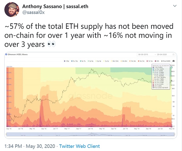 “大約 57% 的 ETH 供應量在1年多的時間里沒有在鏈上移動過;約 16% 在 3 年多時間里未移動過。”