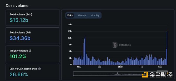 根據DeFiLlama數據顯示,3月11日,DEX總交易額飆升至151.2億美元,創下過去四個月新高,周增長率超過100%,其中Uniswap收取的費用收入也達到了自2022年5月10日以來的最高值,聚合DEX和中心化交易所 (CEX) 交易額比例(該指標反映了DEX的市場主導地位)上升至 26.66%。