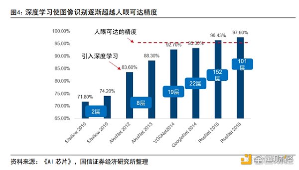 深度學習與傳統的機器學習最主要的區別在于:隨著數據規模的增加,其判斷準確度也在不斷增長。判斷準確度的提升,使人工智能技術可大規模應用于語音識別、圖像識別等多個領域。2006 年,Hinton 提出深度學習算法,該算法與傳統的機器學習算法最大的區別在于隨著數據規模的增加,算法計算準確率也不斷增長。當數據很少時,深度學習算法的性能并不突出,隨著數據量的增加,其優越性得以體現。傳統機器學習算法,在擬合度達到某一特定值后,再增加數據量,其擬合度不再提升;深度學習算法擬合準確度隨著數據量及神經網絡層數的增加而提升。例如,在引入深度學習之前,語音識別的準確率連續三年穩定在 76.4%,引入該算法后,其準確率逐年遞增,2017 年已達94.5%。如判斷某幅圖片是否為猴子,深度學習算法的執行過程如下:人為將海量帶有標簽的圖像數據到計算機中,無需進行任何特征提取或規則設定,算法自動根據輸入圖像的特征歸納出判定規則,并泛化至后續判斷過程中。