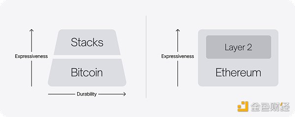 Stacks 采用金字塔形的堆棧,底層是比特幣基礎結算層,然后是增加了智能合約和可編程性的 Stacks,最上層是增加可擴展性和速度的 Hiro。它使用自己的智能合約語言 Clarity,并將歷史交易記錄寫入到了比特幣網絡中,因此 Stacks 是一個比特幣的 Layer 2 (以前 Stacks 也稱自己為 Layer 1 )。Stacks 發行有自己的代幣$STX,作為比特幣智能合約的代表,$STX 也是近期表現最好的資產之一。