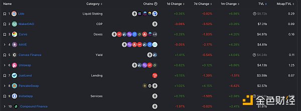 DeFi項目鎖定資產前十排名及鎖倉量 數據來源:defillama