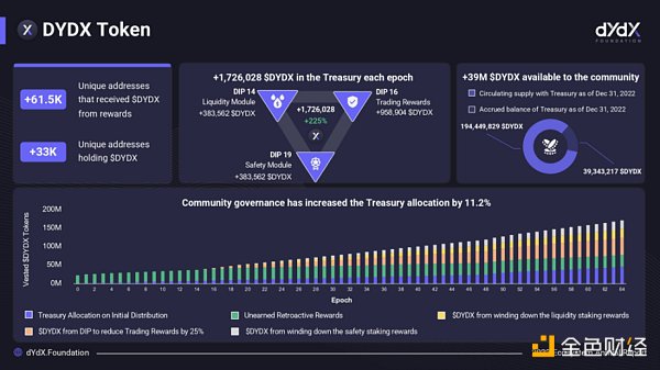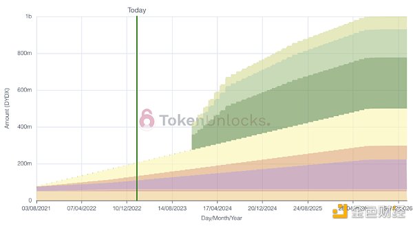 dYdX 團隊初始計劃于 dYdX 代幣發行 18 個月后( 2023 年 3 月)對 50% 分配給投資者、公司及基金會的代幣進行大規模解鎖。但于 2023 年 1 月 25 日,dYdX 基金會宣布該部分初始釋放日期推遲至 2023 年 12 月 1 日。