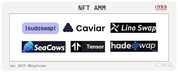 對于NFT自動做市商(AMM),我們主要收錄了以Sudoswap、Caviar等為代表的基于Bonding Curve曲線的AMM。作為實現FT與NFT即時流動性的重要去中心化解決方案,我們相信其在未來的直接交易中將扮演更為核心的角色。
