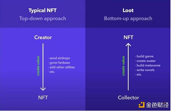 觀點二:游戲內經濟系統甚至物品的設計產出應當交由玩家,即純粹的去中心化市場經濟模式。這種模式在 2021 年 9 月的 Loot 生態中得到實踐并引發市場關注。不同于傳統 Web3 游戲項目,創作者設計創作 NFT 賣給收藏者,Loot 收藏者也會參與到游戲生態的建設中。盡管 Loot 生態在后續的表現欠佳,但在 2023 年全鏈游戲進入視野時 Loot 又成為了人們的討論話題。(有意思的是, 2022 年底大火的 MAGIC 平臺生態也是由 2021 年的 Loot 衍生出的項目)