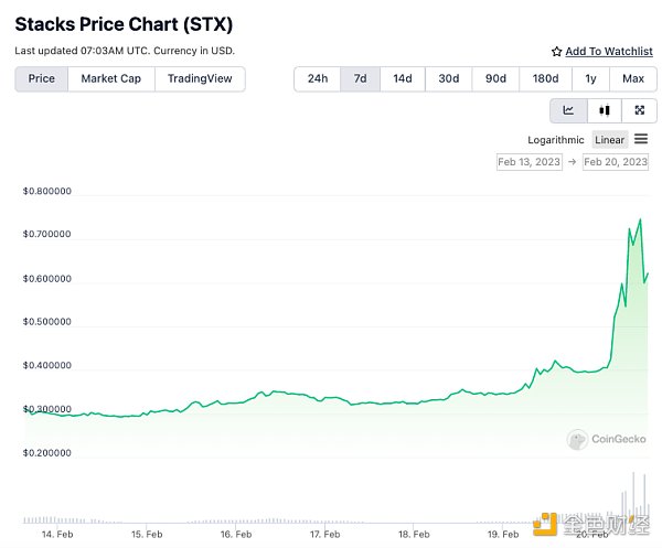 現在這把大火終于燒到Stacks了。Stacks代幣STX在從18日的0.32美元一路暴漲至20日的0.74美元,2天之內翻倍。雖然后來目前有所回落,截止發稿,STX價格仍達0.62美元。