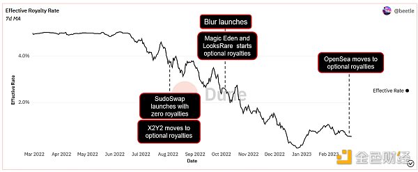 在牛市結束后,流動性不足的市場狀況為 Sudoswap 和 Magic Eden 等新興 NFT 市場奠定了基礎,以零版稅政策開始試水市場。而近幾個月來,Blur 的崛起更是以一己之力加速了 NFT 版稅市場標準的廢除。