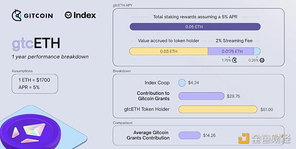 Gitcoin 官方舉了個例子,假設 ETH 穩定在 1700 美元,質押收益穩定在 5% 左右,那么一年下來 1 單位的 ETH 將可獲得 0.05 ETH 的質押收益。如果用戶選擇持有 gtcETH,那么 0.05 ETH 中的 0.03 ETH 將歸用戶所有,剩余 0.02% 將被剝離,其中 0.0175 將流向 Gitcoin Grants 用于捐增,剩余 0.0025 則將作為費用流向 Index Coop。