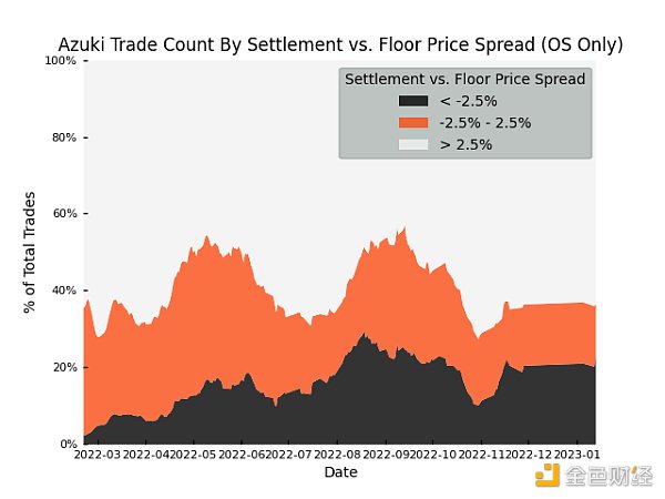 NFT 交易同質化的最直接證據是對地板價 NFT 不斷增長的需求。有些人甚至認為,NFT 只是“圖片形式的山寨幣”。事實上,當我們比較 OpenSea 上的結算價格和地板價格時,我們會發現相當大部分的交易是圍繞地板價進行的。