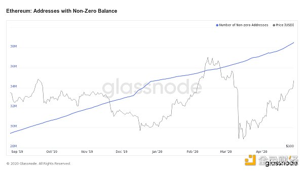 據Glassnode分析數據,以太坊非零余額地址總量目前接近4000萬且每天都在加速增長。此外,非零余額以太坊地址新增量也超過了10萬(使用30天平均值評估),創下自2018年3月以來的最高水平。