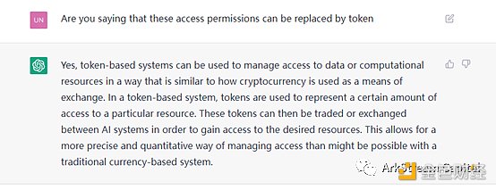 如果AI之間進行交易,它們會用法幣還是數字貨幣來交換?我曾向ChatGPT問了這個問題,他回答我說,用Token對數據訪問的權限進行量化定價是一個相比于傳統貨幣更好的方案。