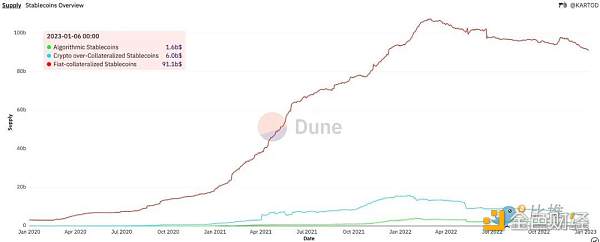 正如@RZinovyev 在 DuneAnalytics 上指出的那樣,迄今為止,相較于超額抵押和算法穩定幣,法幣抵押的穩定幣是最廣泛得到使用的。