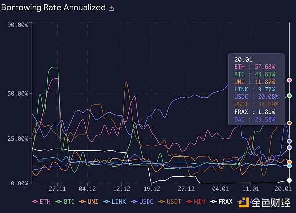 如果考慮資金費用,GMX中多頭的資金費用要遠高于空頭,如果考慮到資金費用而不在GMX做空,那此時應該更沒有人做多(截至1月20日,ETH的借幣年化利率為57%,USDC的借幣年化利率為20%,做多者借入ETH等風險資產,做空者借入穩定幣)。