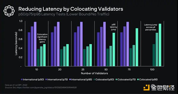 為什么要進行主機托管?如果驗證器在地理位置上分散,信息的傳輸就需要更長的時間,也就導致在達成共識和產生區塊時會有更高的延遲。訂單簿交易平臺需要盡可能地減少延遲。Sei 再次公布了他們圍繞主機托管的一些測試結果:
