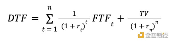 其中 FTFt 代表第 t 年的自由代幣流量,rt 代表第 t 年的折現系數,TV 代表最終價值。
